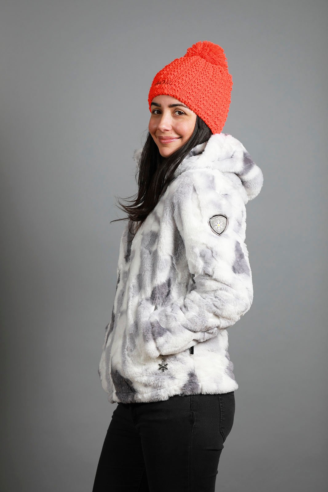Veste femme VENISE , magnifique blouson fourrure avec capuche. Coupe droite , fermeture par zip Flocon. Deux poches zippées avec curseur flocon. du S au 2XL.